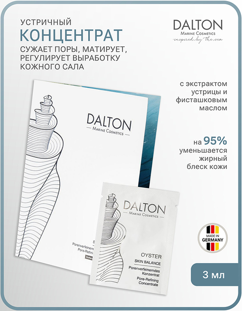 ПРИМЕНЕНИЕ • Встряхните перед использованием. Наносите 1-2 капли утром и вечером на очищенную и обработанную тоником кожу лица, шеи и декольте легкими похлопывающими движениями, аккуратно вотрите в кожу. Используйте перед нанесением Устричного крема (арт. 58 510 50) или любого другого ухаживающего крема DALTON.