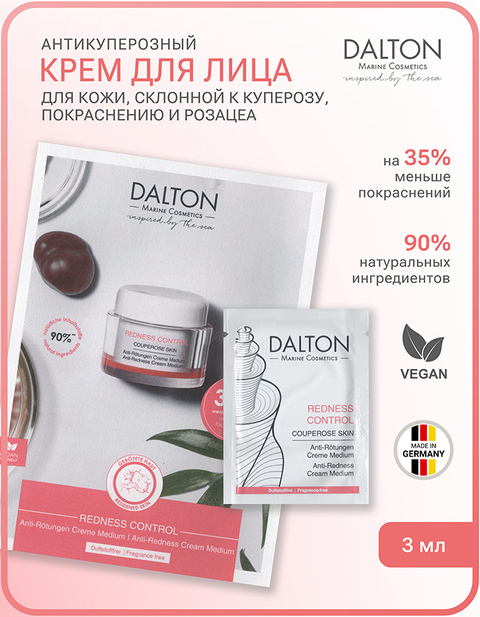 ОПИСАНИЕ • Ухаживающий дневной крем с комплексом активных ингредиентов для кожи, склонной к куперозу и покраснениям. Питает и увлажняет кожу, делает ее более упругой, уменьшает покраснения и укрепляет капилляры за счет уникальной формулы - комплекса лекарственных трав. Выравнивает и защищает кожу. Крем без отдушек заметно уменьшает расширение кровеносных сосудов до 21%*. Укрепляющая формула DALTON, состоящая из 5 трав (конского каштана, иглицы колючей, календулы, корня солодки и центеллы азиатской) смягчает раздраженную и чувствительную кожу и придаёт ей сбалансированный и ровный тон. Крем помогает уменьшить покраснения кожи почти на 35%*. Экстракт дрожжей укрепляет естественную иммунную систему кожи, а успокаивающие кожу аллантоин, пантенол и бисаболол способствуют заживлению и регенерации кожи. Нежирный крем против покраснений быстро впитывается, не оставляя липких следов. Он идеально подходит для нормальной и сухой кожи, склонной к покраснениям и повреждениям кровеносных сосудов.