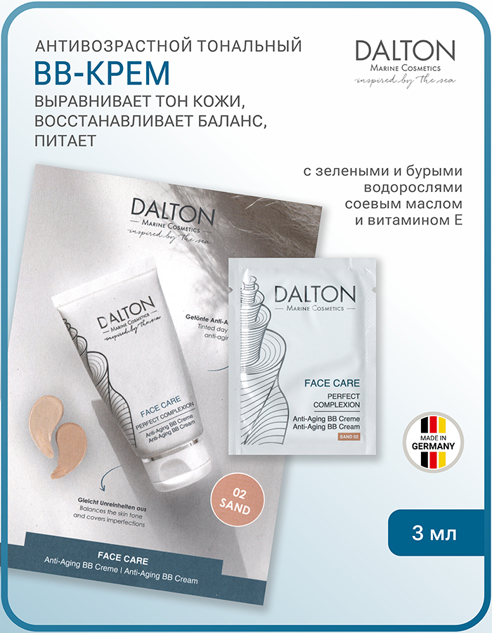 Аббревиатура "ВВ" означает "Бальзам от несовершенств" (Blemish Balm) или "Бальзам для красоты" (Beauty Balm). Тональный увлажняющий крем DALTON – или ВВ–крем - с минерализованными цветными пигментами обеспечивает быстрое восстановление красоты и придает Вам идеальный цвет лица всего за один шаг. Тональная формула отлично подходит для маскирования пигментных пятен, синяков под глазами и других несовершенств. Он подходит для всех типов кожи и обладает замечательными омолаживающими свойствами благодаря Морскому экстракту Celumer и различным другим ингредиентам на основе водорослей. Бурые водоросли увлажняют, оживляют кожу и разглаживают тонкие линии и морщины, в то время как антиоксидантные зеленые водоросли помогают поддерживать здоровый микробиом кожи, уменьшают покраснения и улучшают цвет лица с длительным эффектом. Пантенол оказывает успокаивающее действие. Независимо от того, жирная у Вас кожа, сухая, чувствительная, комбинированная или зрелая, ВВ-крем быстро впитывается без ощущения липкости и оставляет шелковисто-мягкое и естественное покрытие.
